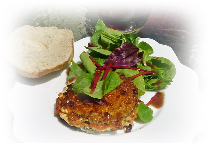 … with cheese (feta or goat cheese are good) and something else delicious such a spicy tomato sauce, coat in breadcrumbs as with the aubergine croutons above and shallow fry on both sides till crisp out the outside and meltingly delicious in the middle.