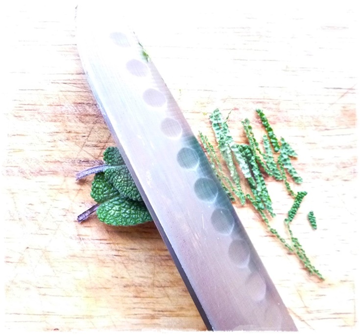 ~   Chiffonade – aka fine shreds. This is especially useful for larger leaves such as basil or sage. It is quicker if you pile up a few of the leaves and slice them all together or with big leaves roll them up before slicing.