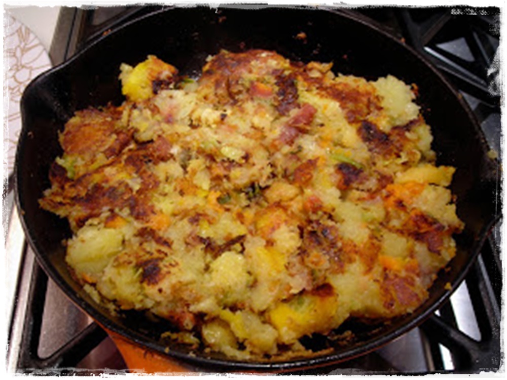 Whatever it’s called this dish is made from leftover vegetables, primarily cold potatoes and cabbage, crushed together and shallow fried in butter, oil or bacon fat till crisp. The trick to this is letting the mixture sit over a medium heat, undisturbed, for a few minutes allowing a crust to form before turning. In a little more detail …