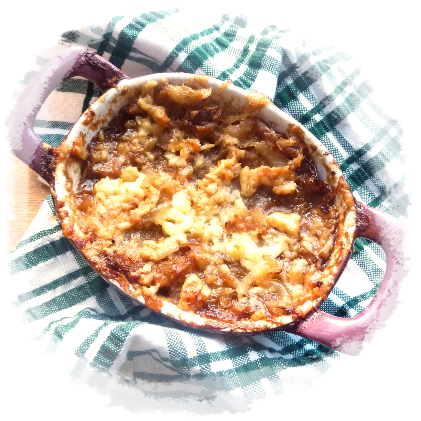 This is also surprisingly lovely! A kind of French onion soup / bread pudding cross! It is best made with more substantial leftover bread rather than the soft stuff.