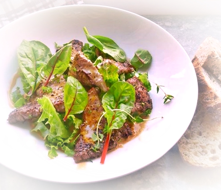 ~   Arrange the dressed leaves on a plate, the steak on the leaves and then drizzle with the
