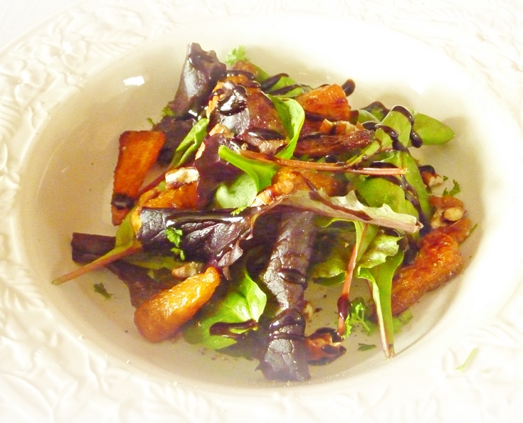 Roasted Chantenay carrots make a wonderful salad warm or cold tossed with a few toasted pecans and tender leaves and then drizzled with balsamic glaze. You can make this glaze yourself by boiling down balsamic vinegar to about a quarter of its volume and sweetening with honey but it is easier and less smelly to buy it.  Season with lots of freshly ground black pepper and crunchy sea salt.